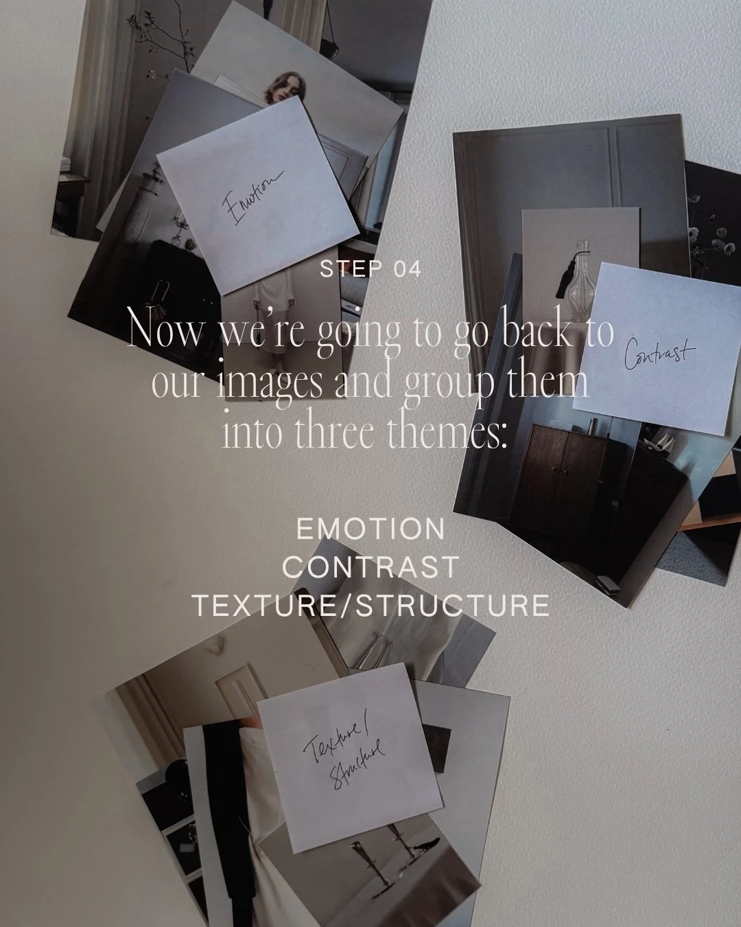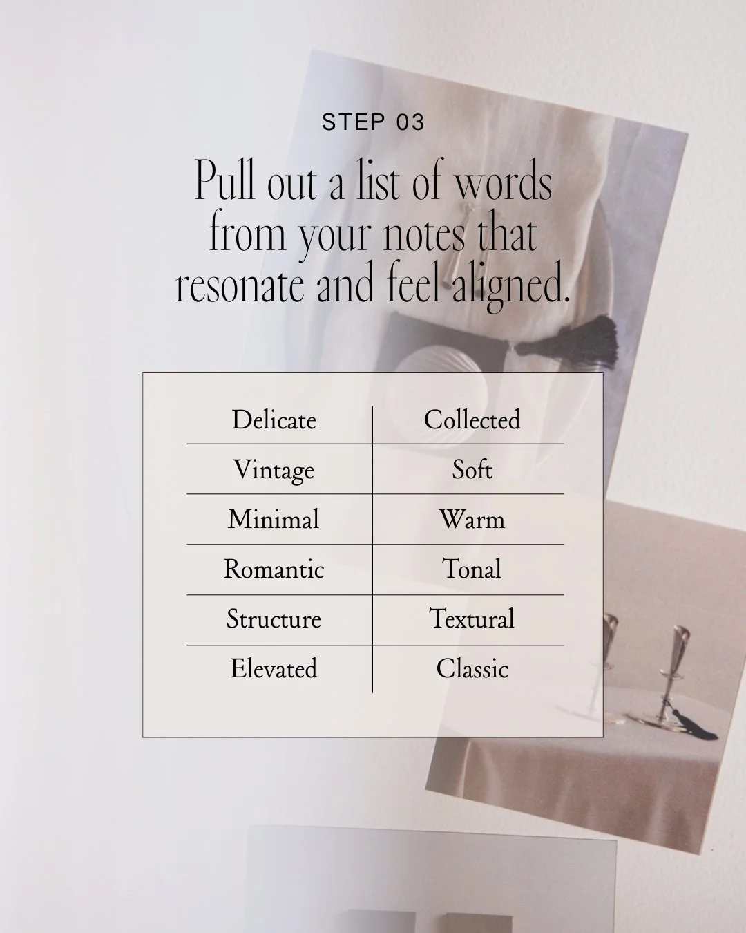 To give those words structure (so they don’t just become one long list of “vibes”), it helps to sort them into three simple categories. This is the structure I come back to again and again when building creative direction:
