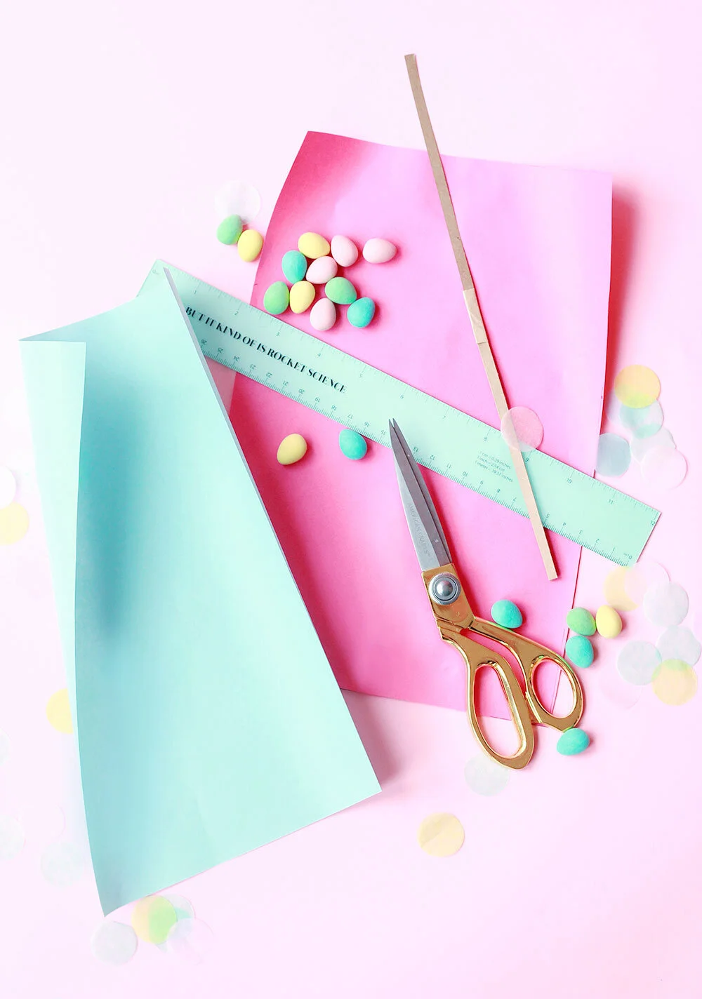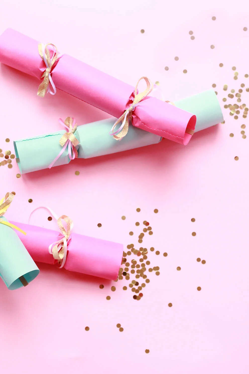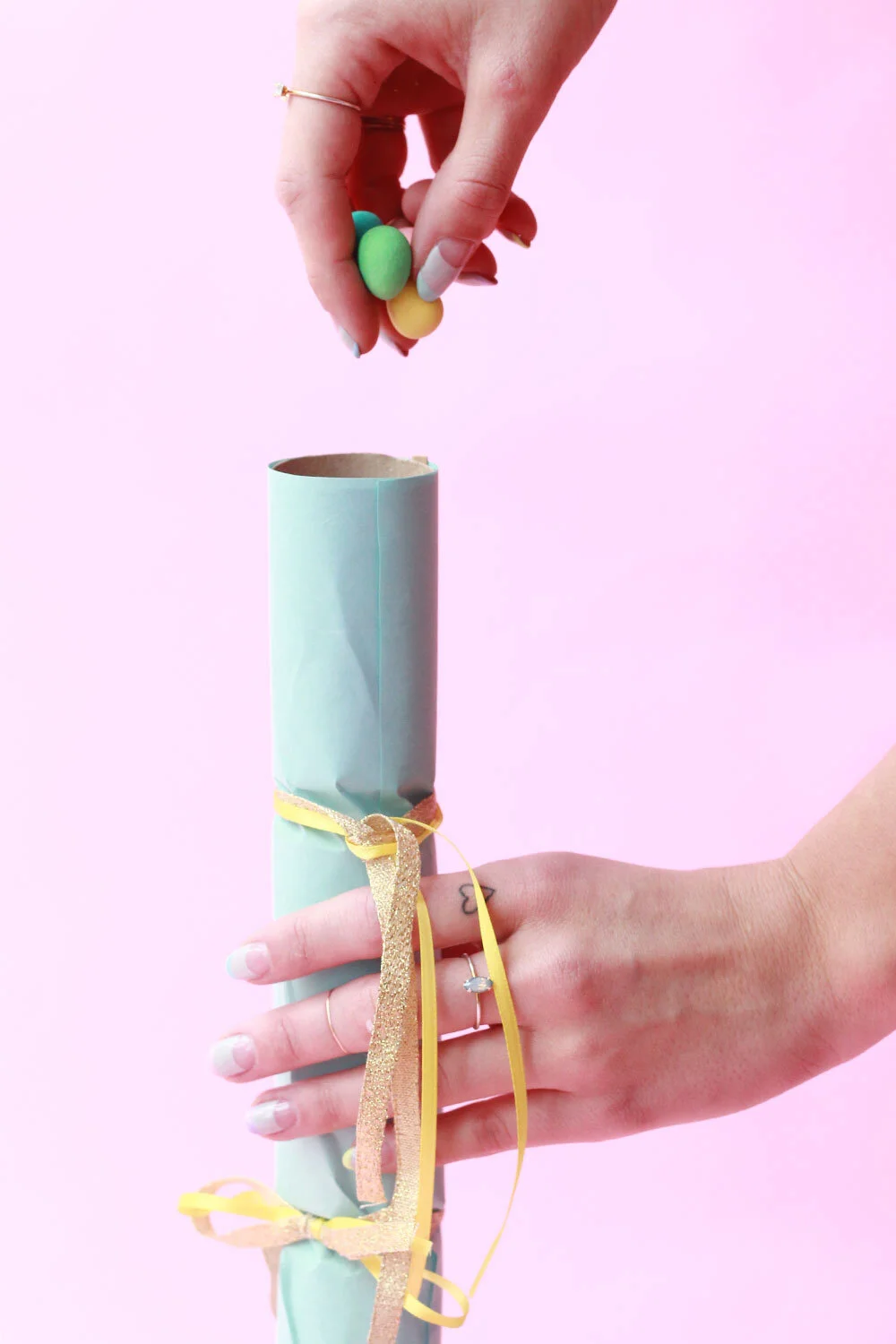 The best part about this craft is picking out the stuffing, and we highly recommend you get creative. Try writing out "fortunes" on pastel paper, splurging on special treats, and maybe even adding a touch of sparkle. The sky is really the limit when it comes to cracker magic, and all the pastel goodies in stores this time of year make the hunt that much more fun!