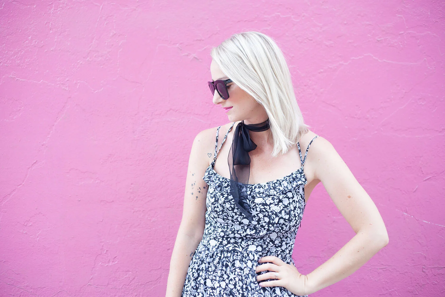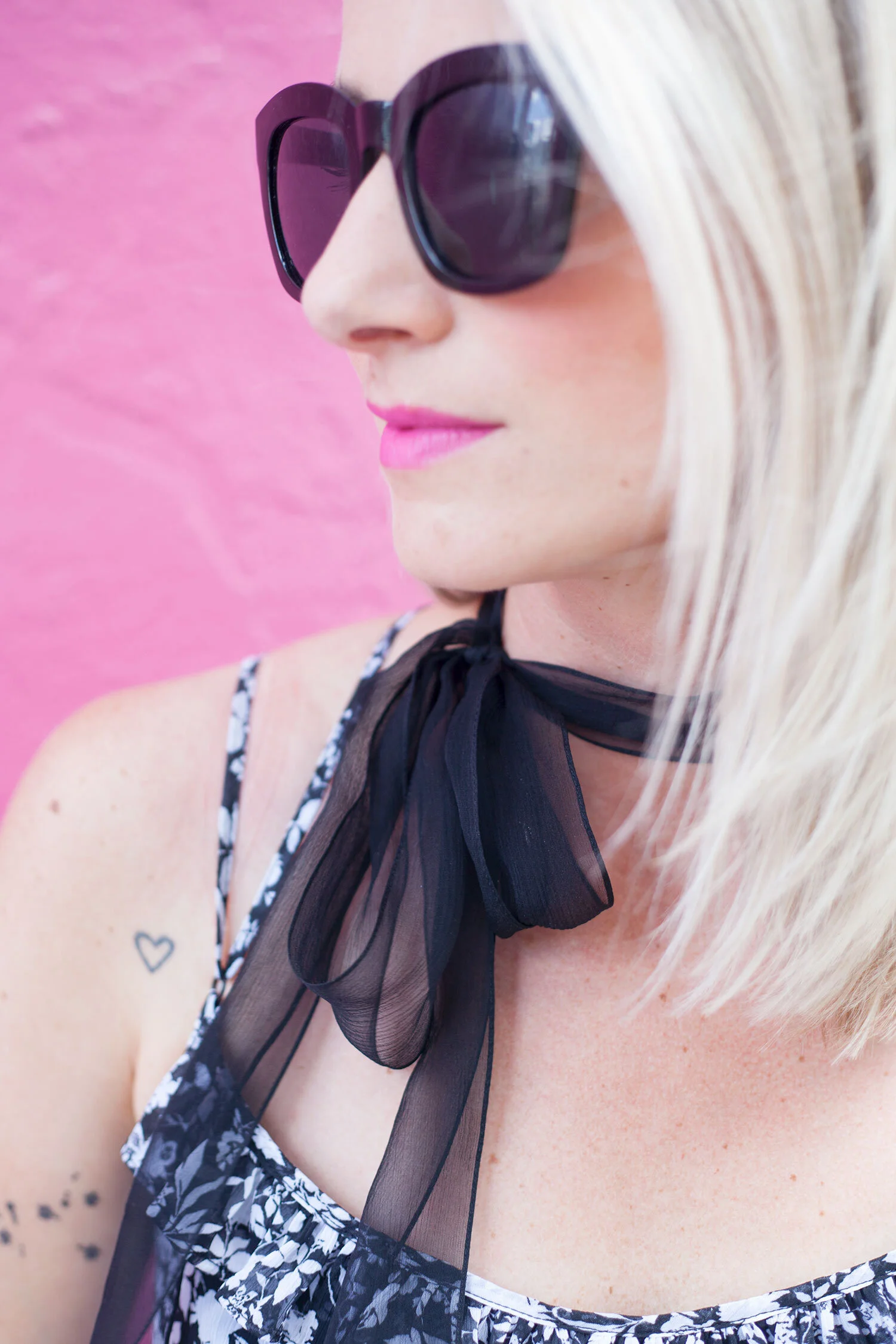I've been wearing this dainty floral print number regularly, and as I was playing around with ways to dress it up a little for a coffee date this past weekend, I decided to try something a little different. Enter one of my favourite sheer ribbons, which is a go-to for me paired with collared shirts and sweaters in the cooler months. With the recent choker trend and starting to see dainty scarves being tied at the neckline in place of jewellery, this is my take on that, which offers a bit of Parisian flair that I'm quite pleased with.