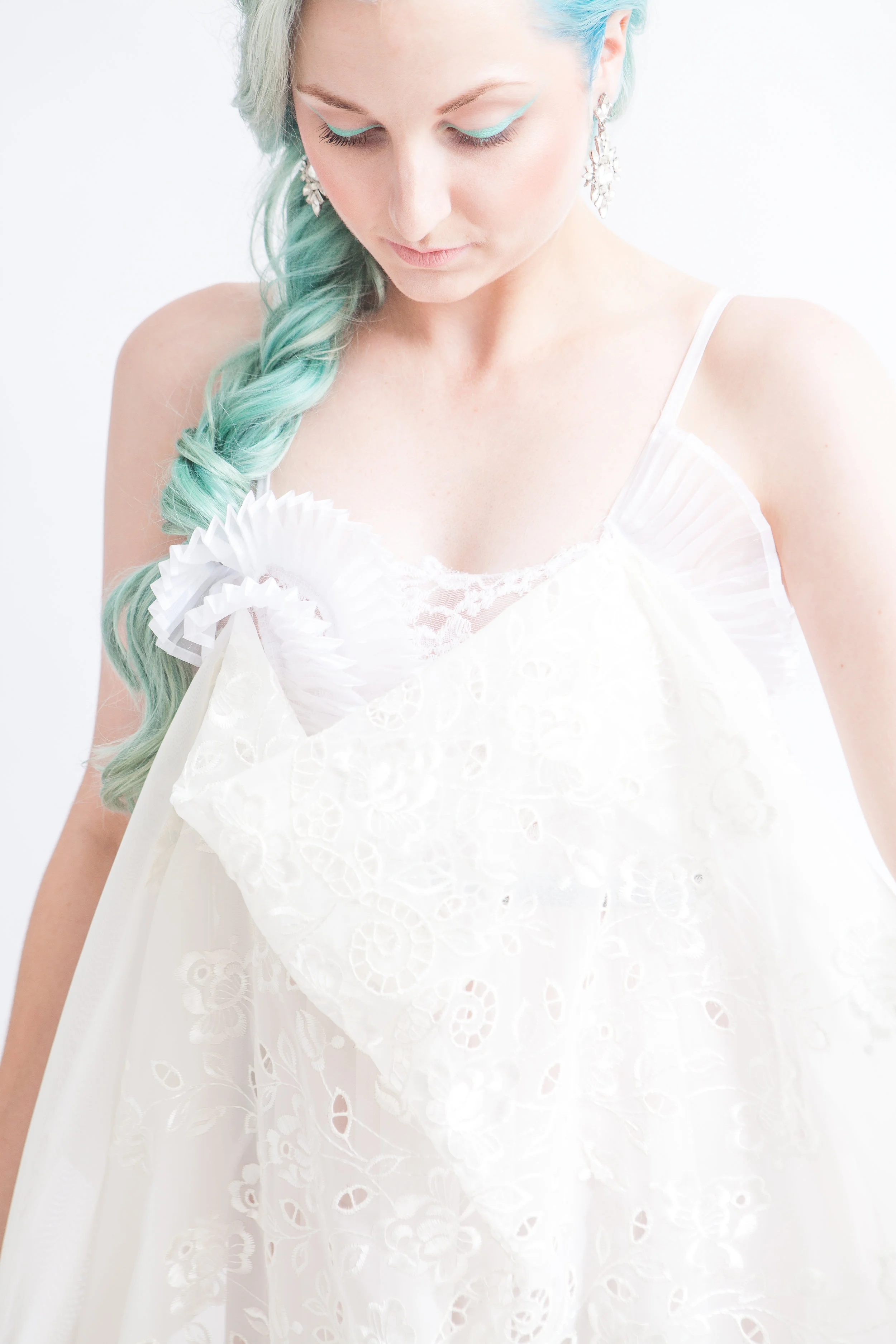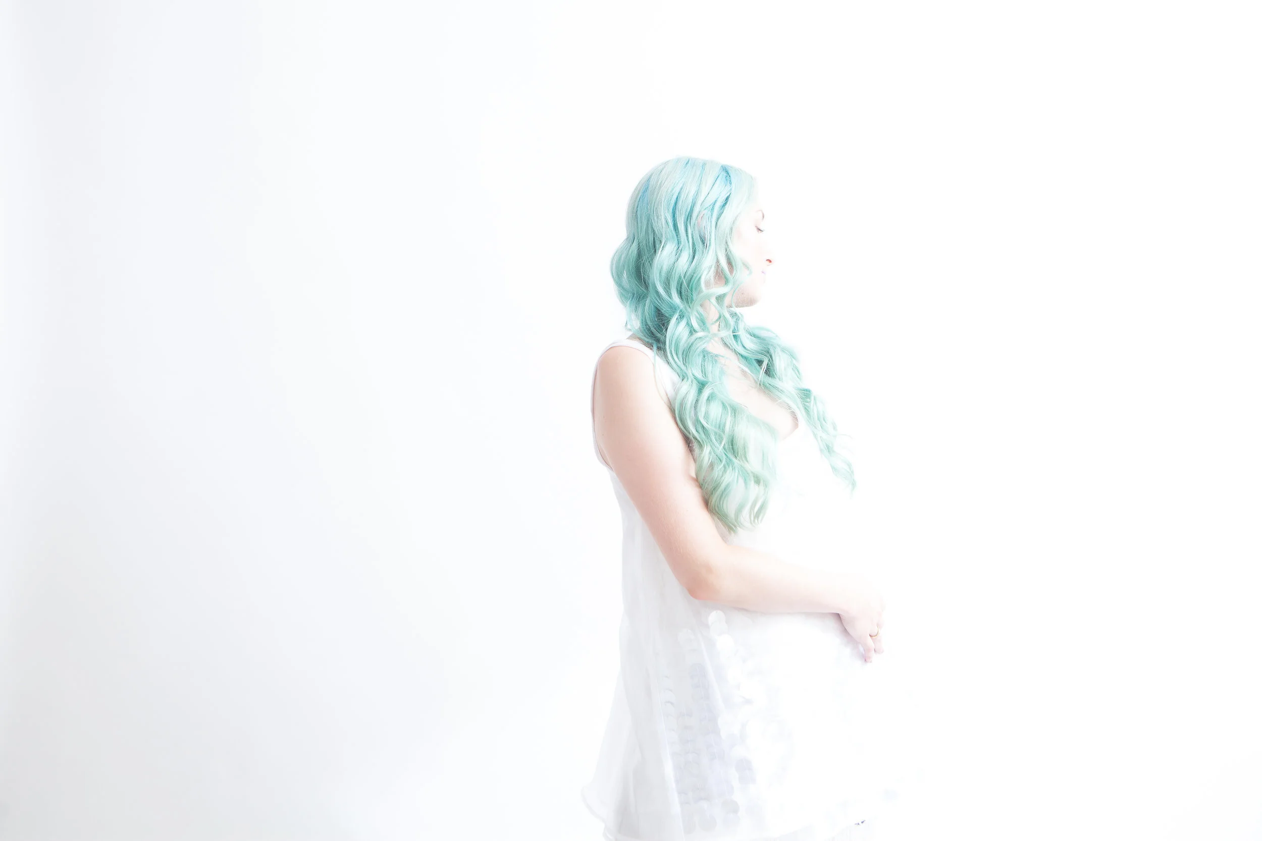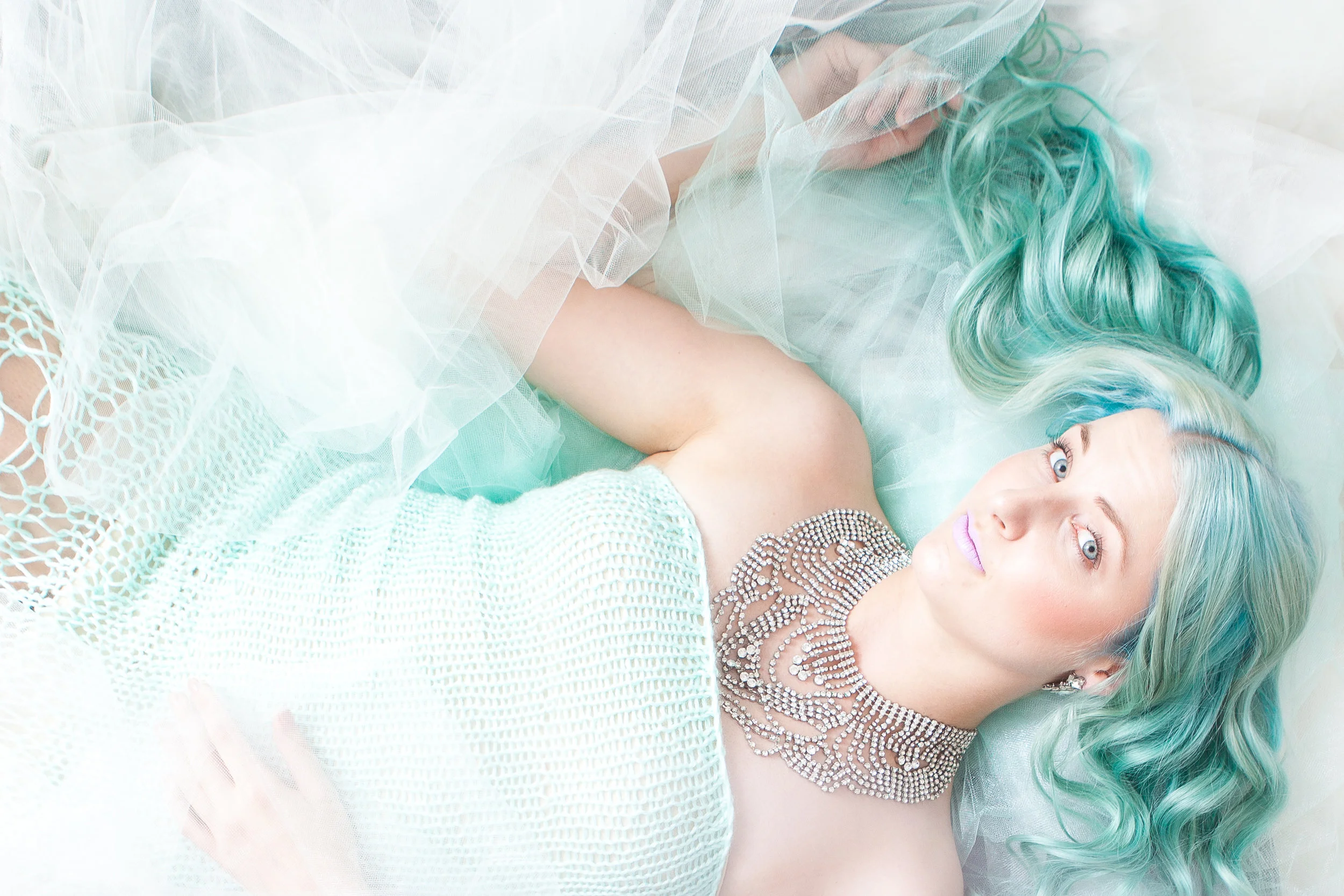 This is exactly what happened when Breeyn came to me with the idea for our Seafoam shoot, inspired by the most magical turquoise hair of our friend Alena and brought to life by a collection of Breeyn's creations. Dresses adorned with shimmering iridescent sequins and woven with intricate layers of ocean-hued yarn quickly brought to life our concept, and we put together a little dream team of creatives to help tell our story.