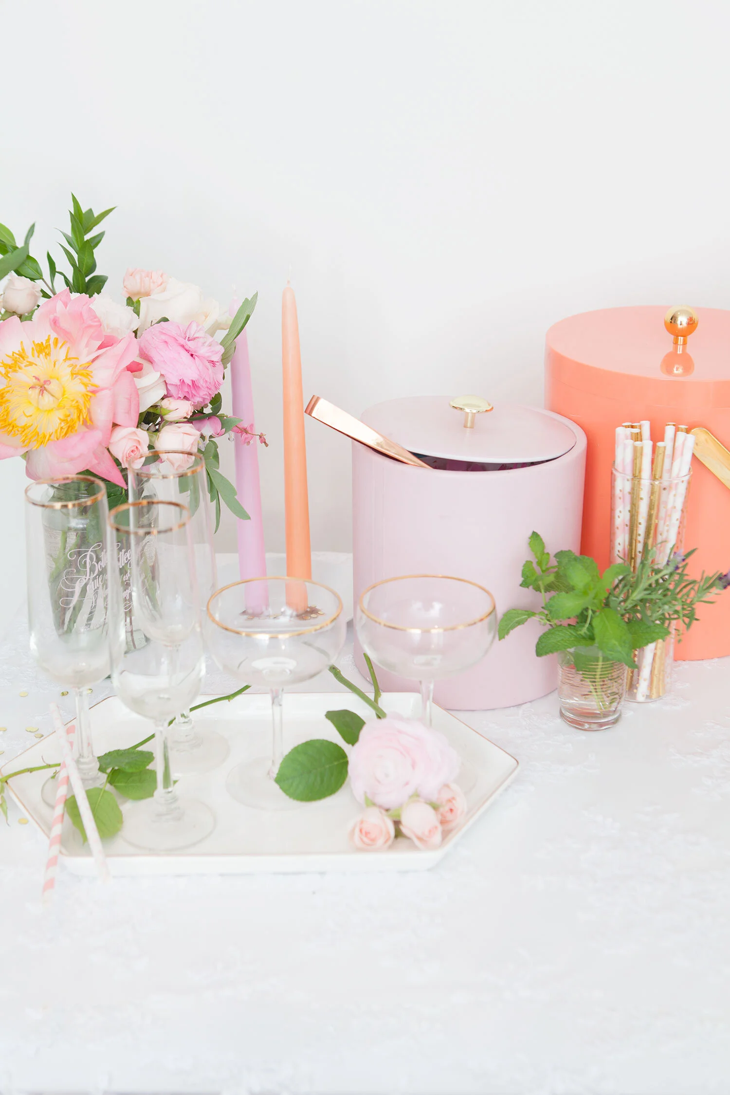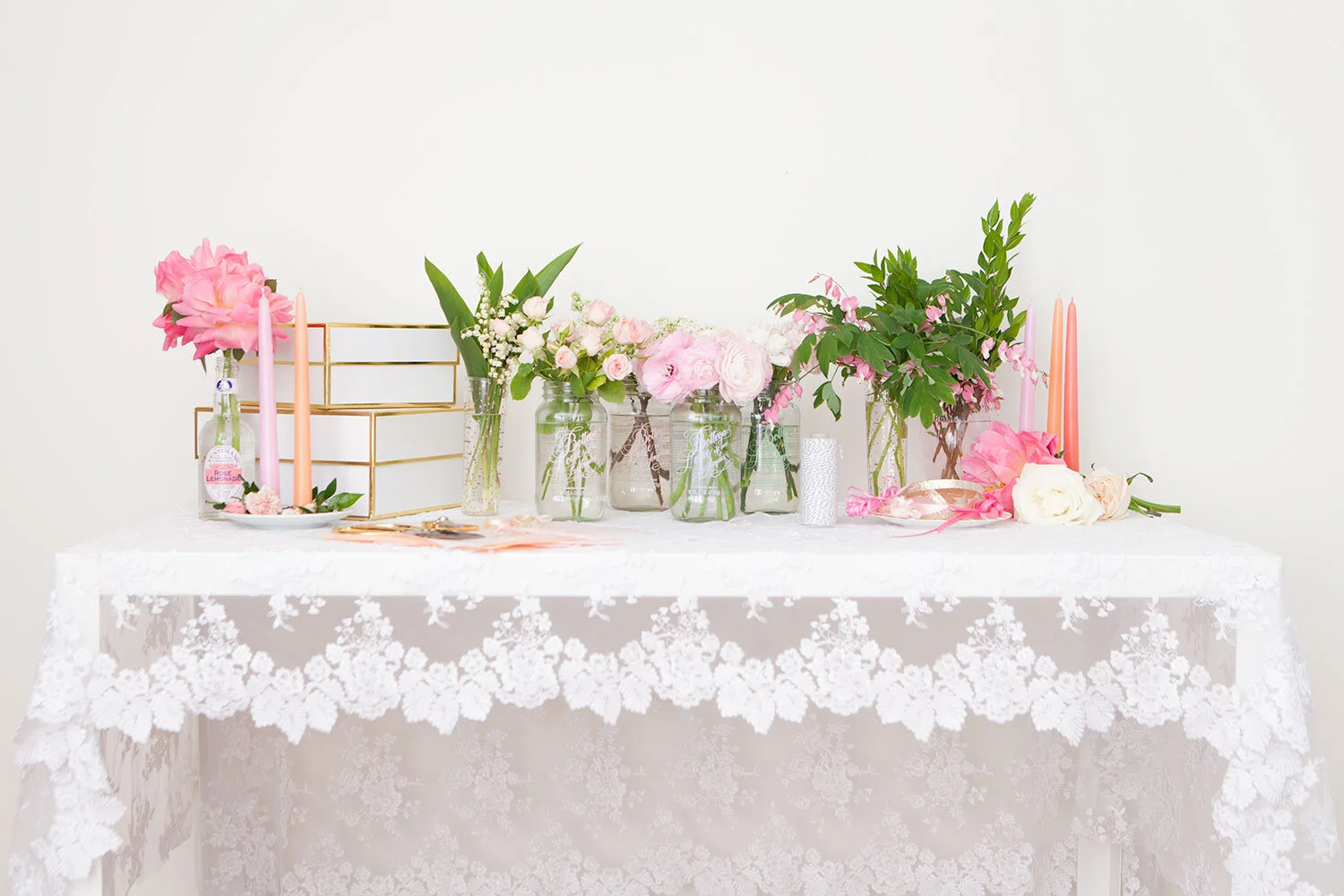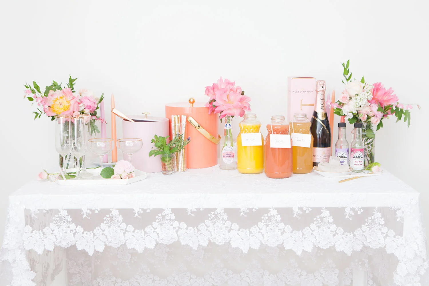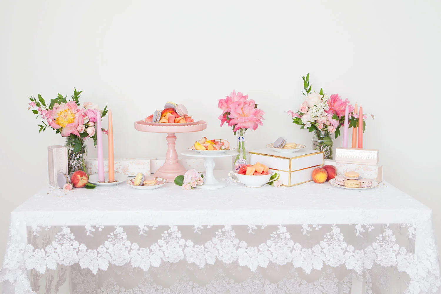 Alyssa and I dreamed up this peachy party bar shoot with the idea that anyone could add one (or all three) of these simple DIY spreads to their bridal shower, baby shower, or summer party setup. They’re the perfect way to add some colour to your party, whatever you’re celebrating! All you need is a lacy tablecloth, fresh flowers, and a few really simple, easy to find props.