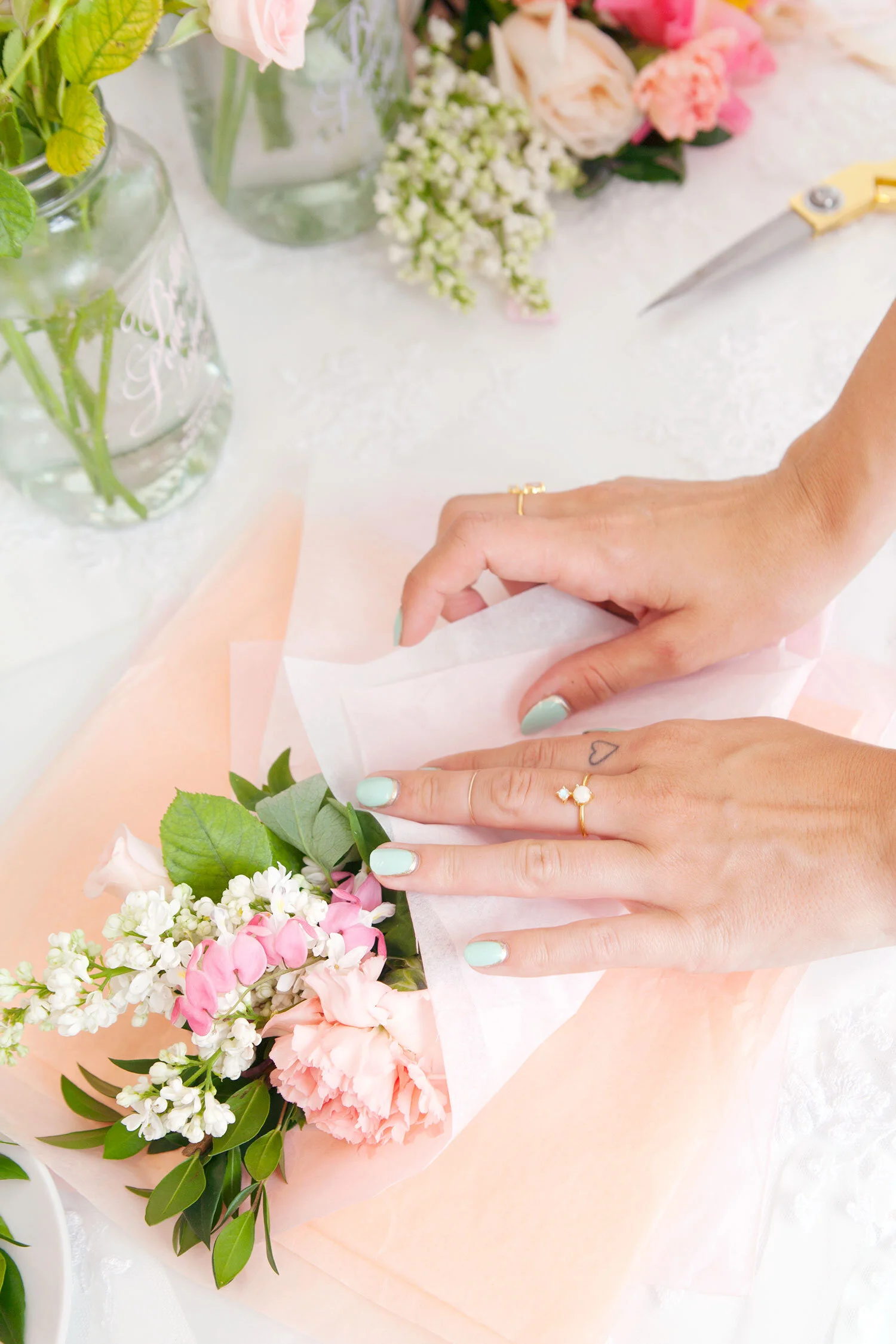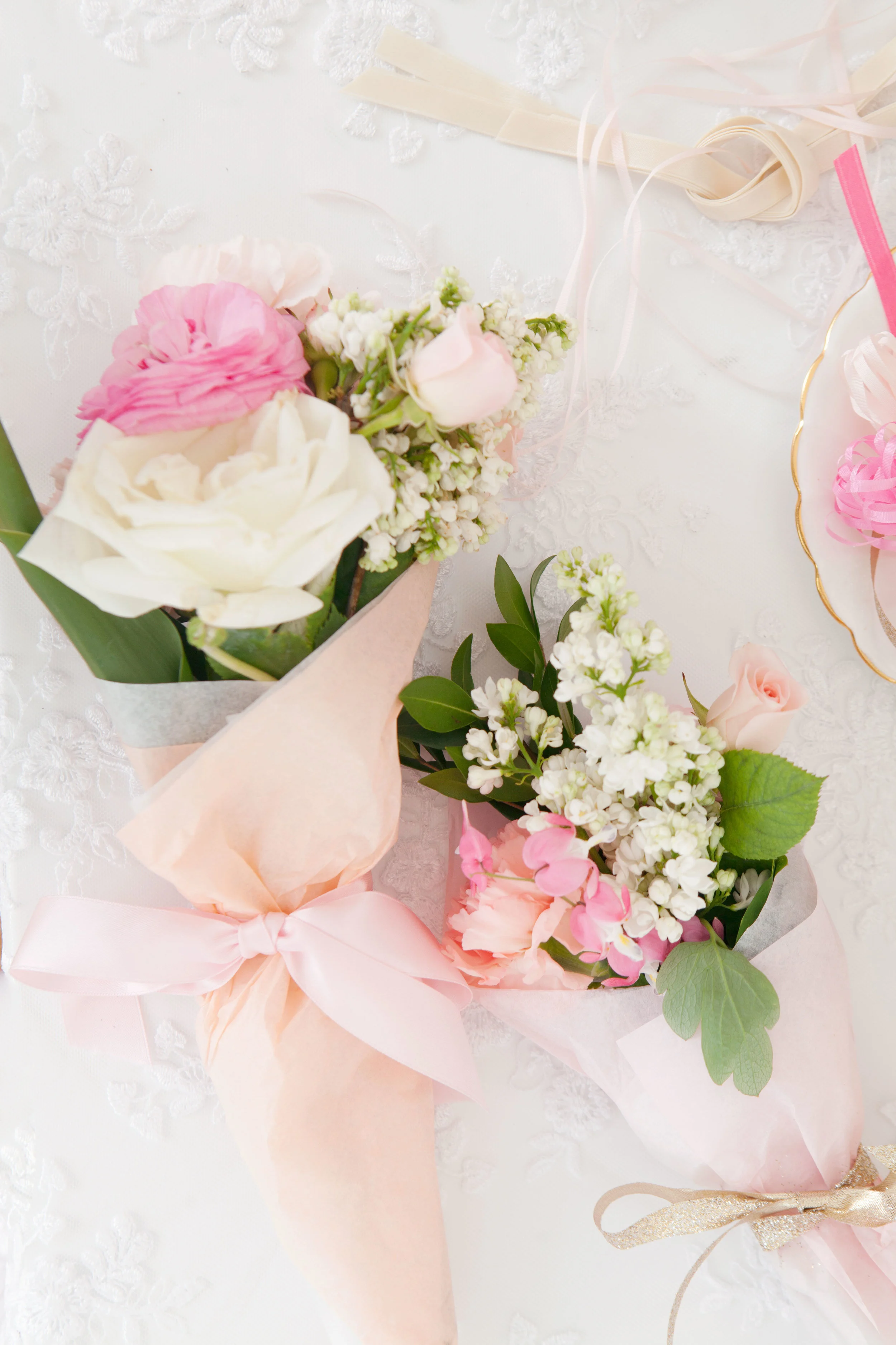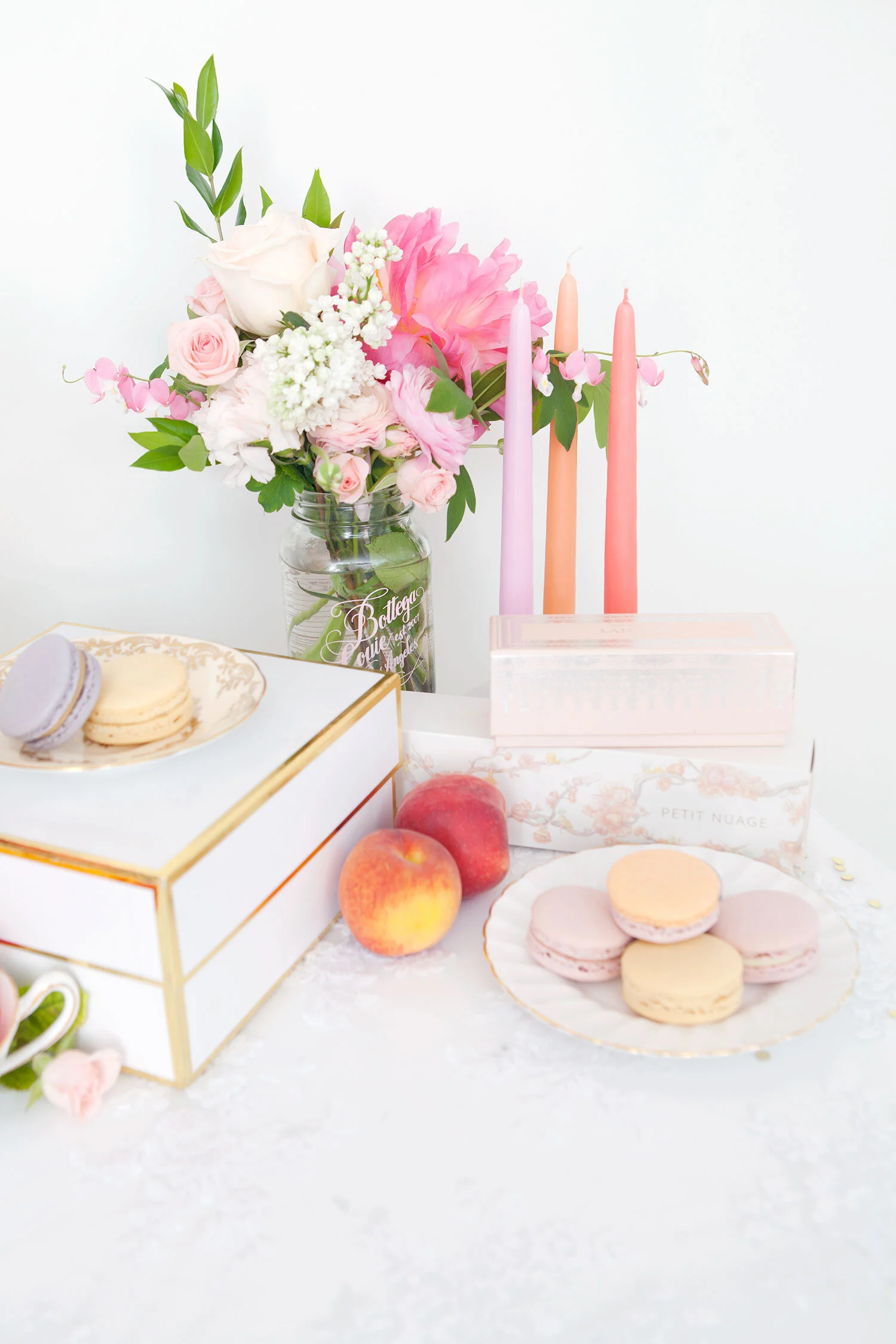 Alyssa and I dreamed up this peachy party bar shoot with the idea that anyone could add one (or all three) of these simple DIY spreads to their bridal shower, baby shower, or summer party setup. They’re the perfect way to add some colour to your party, whatever you’re celebrating! All you need is a lacy tablecloth, fresh flowers, and a few really simple, easy to find props.