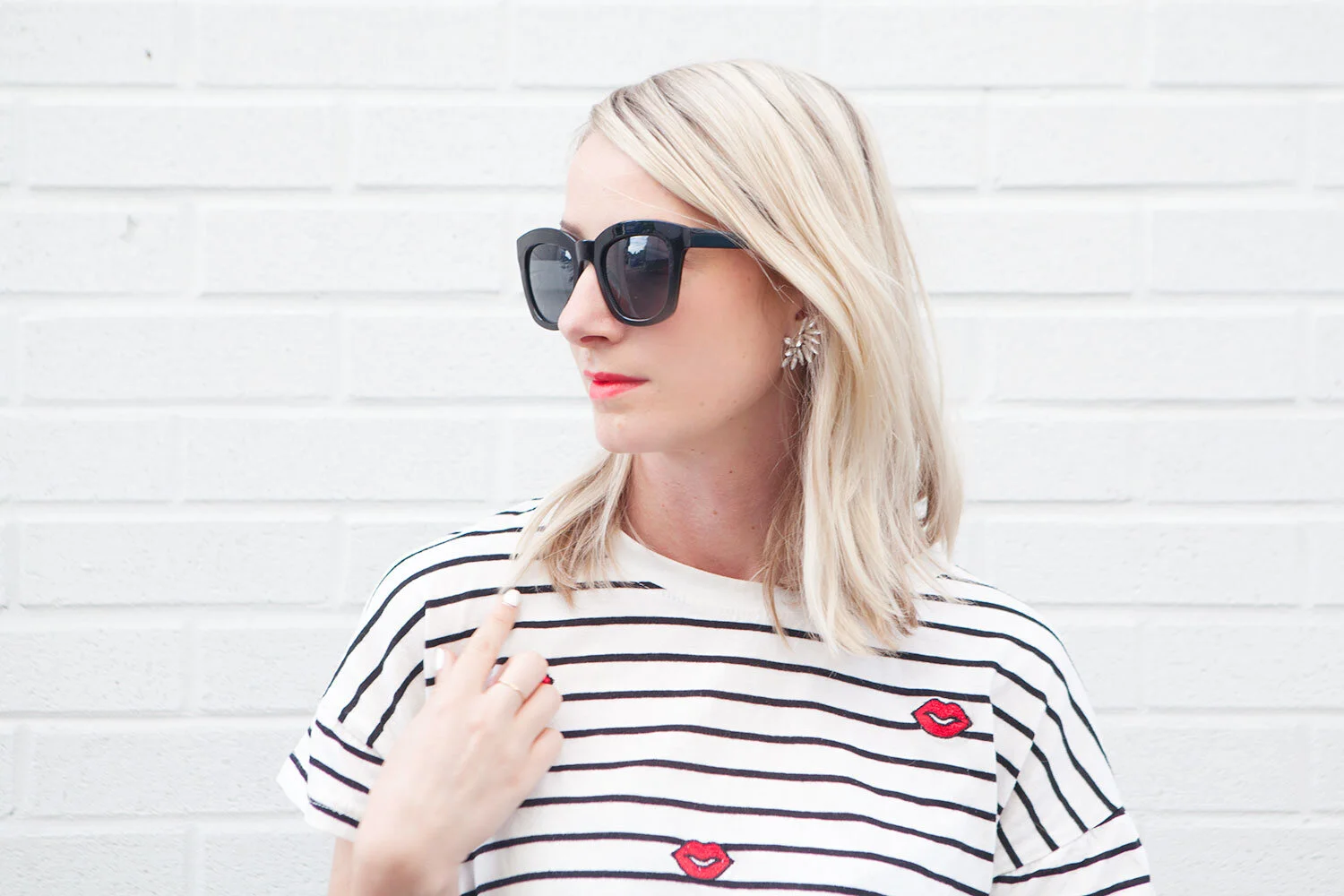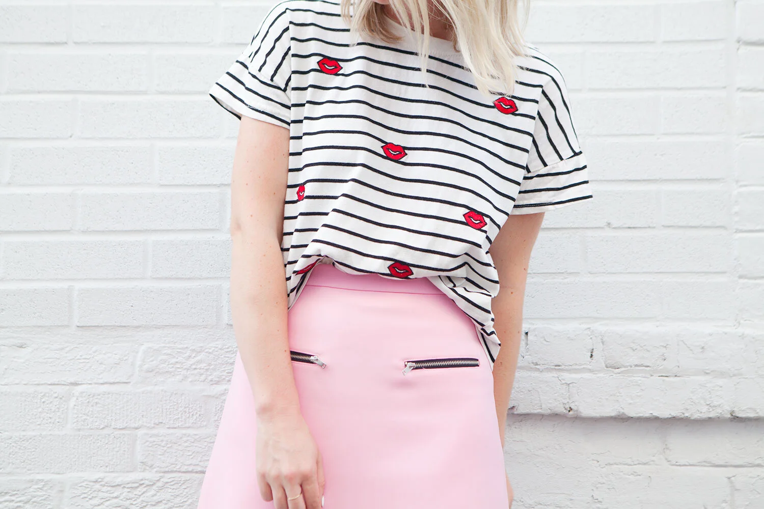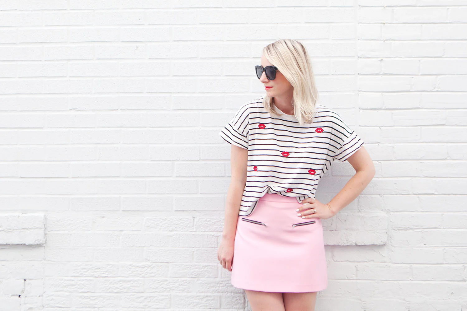 So though I appreciate that minimalistic style and have definitely tried to incorporate it into outfits and designs in the past, you're more apt to find me mixing simple silhouettes with bubblegum pink, a classic striped tee adorned with red lips and yes, a dash of sparkle and a bright lip.