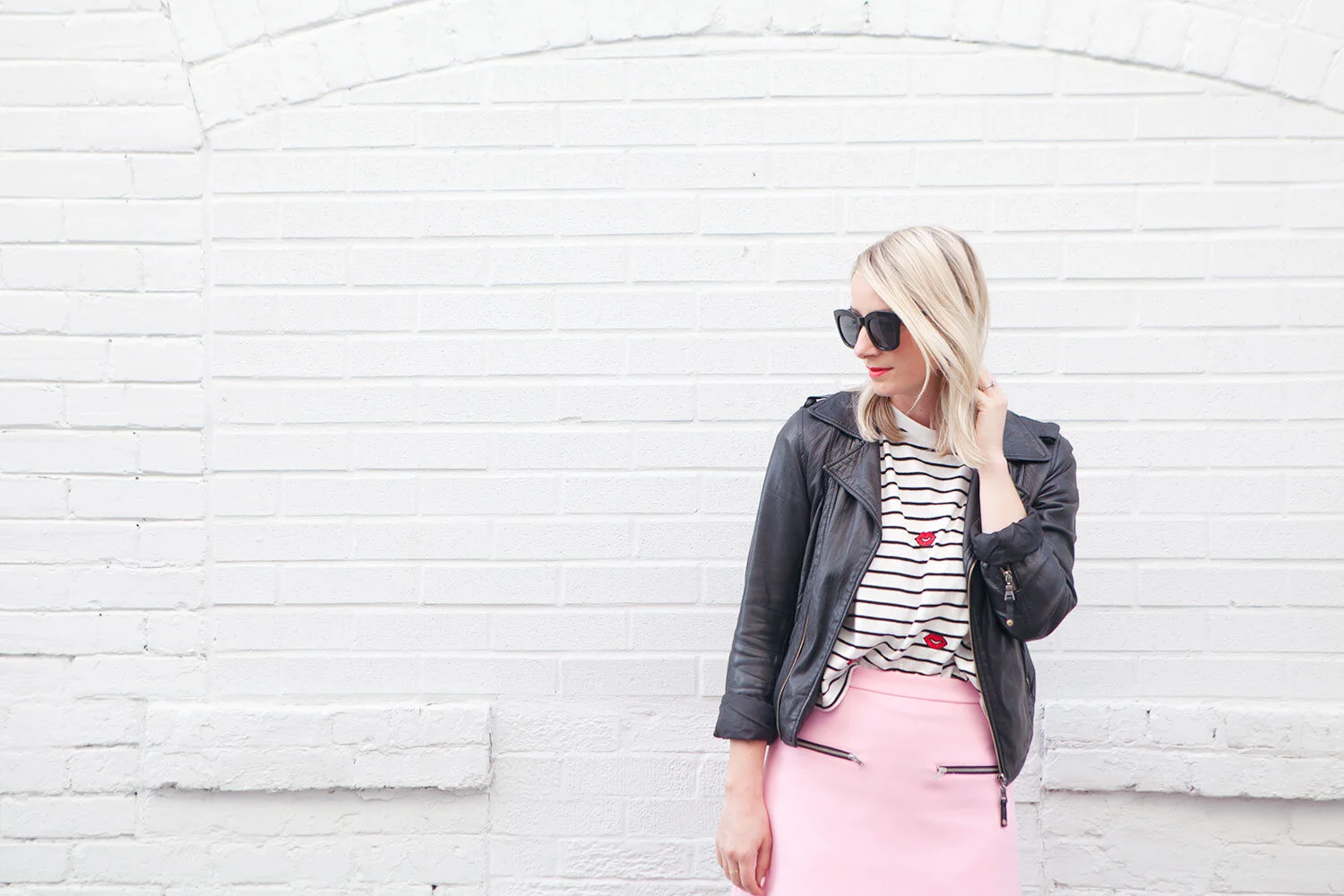 Zara Pink Skirt // Striped Tee (old) // Leather Jacket (old) // Aldo Accessories Earrings