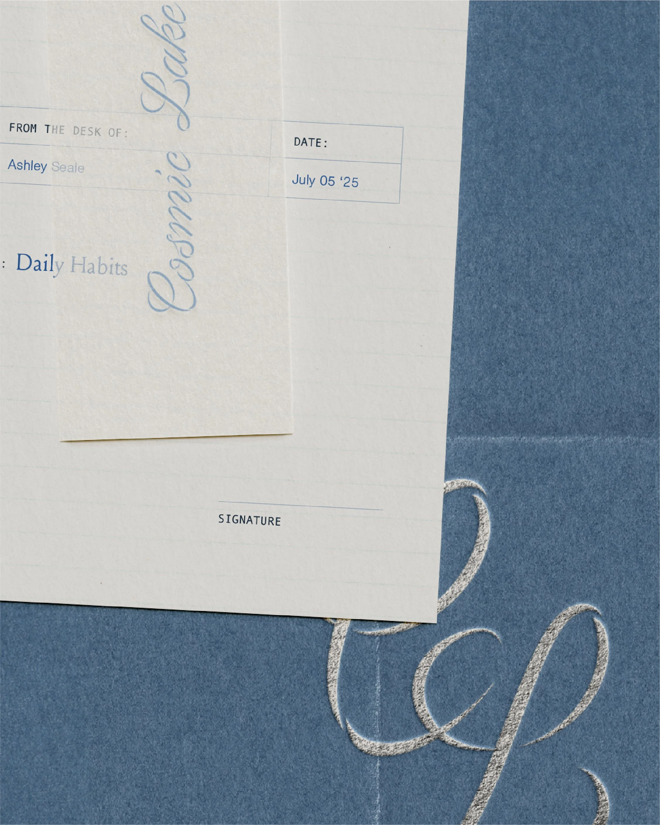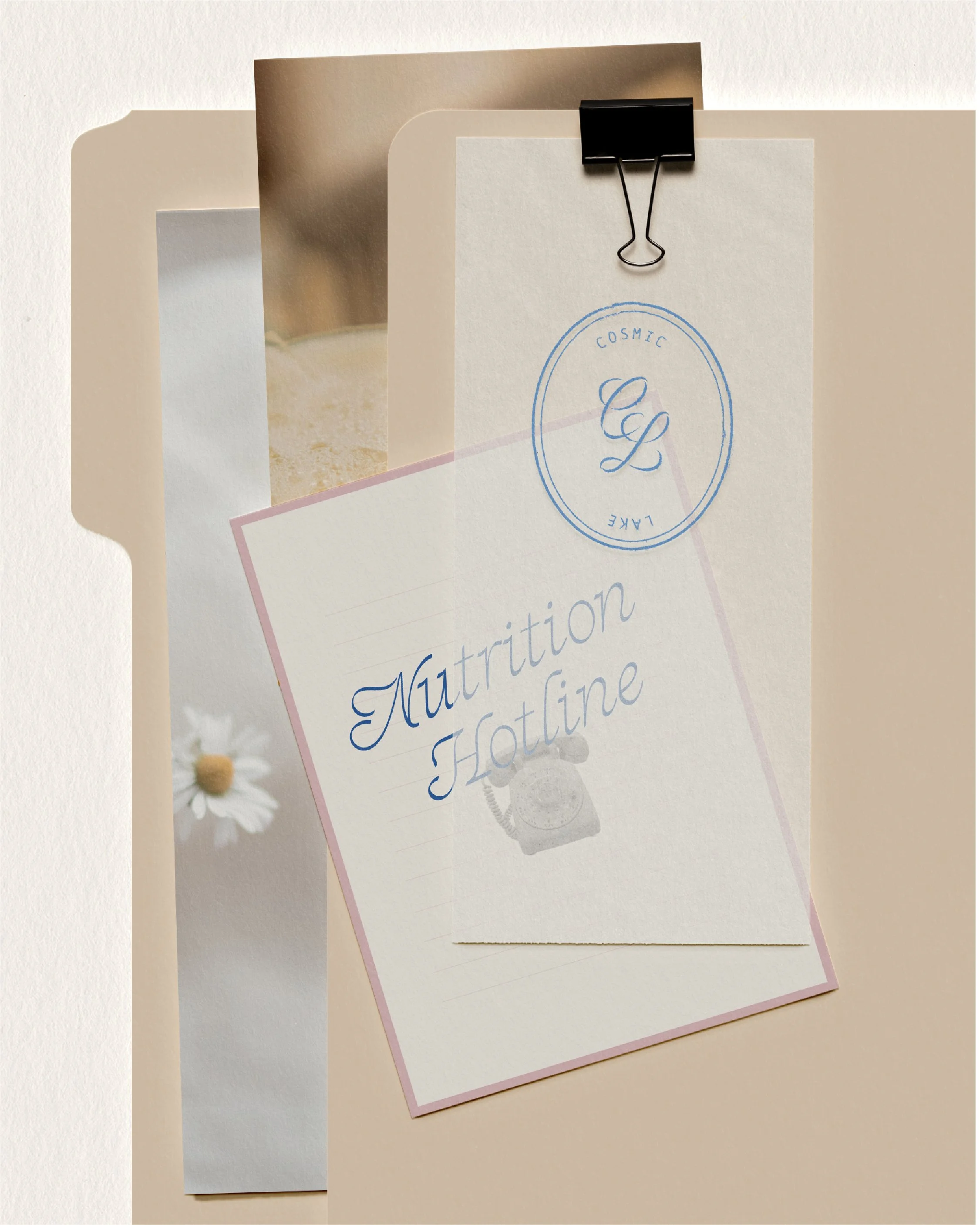 We imagined Cosmic Lake as something tactile and expansive — a swirl of science and softness, scribbled notes and nutrition guidance, care plans and collage. Together with founder Ashley Seale, we built a brand world that blends digital with analog: RX pads with charm, scrapbook-style visuals, and a library of custom-scanned elements, all designed to feel intentionally imperfect, layered, and full of meaning.